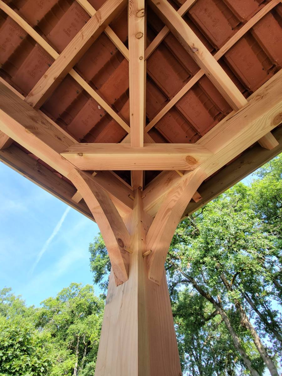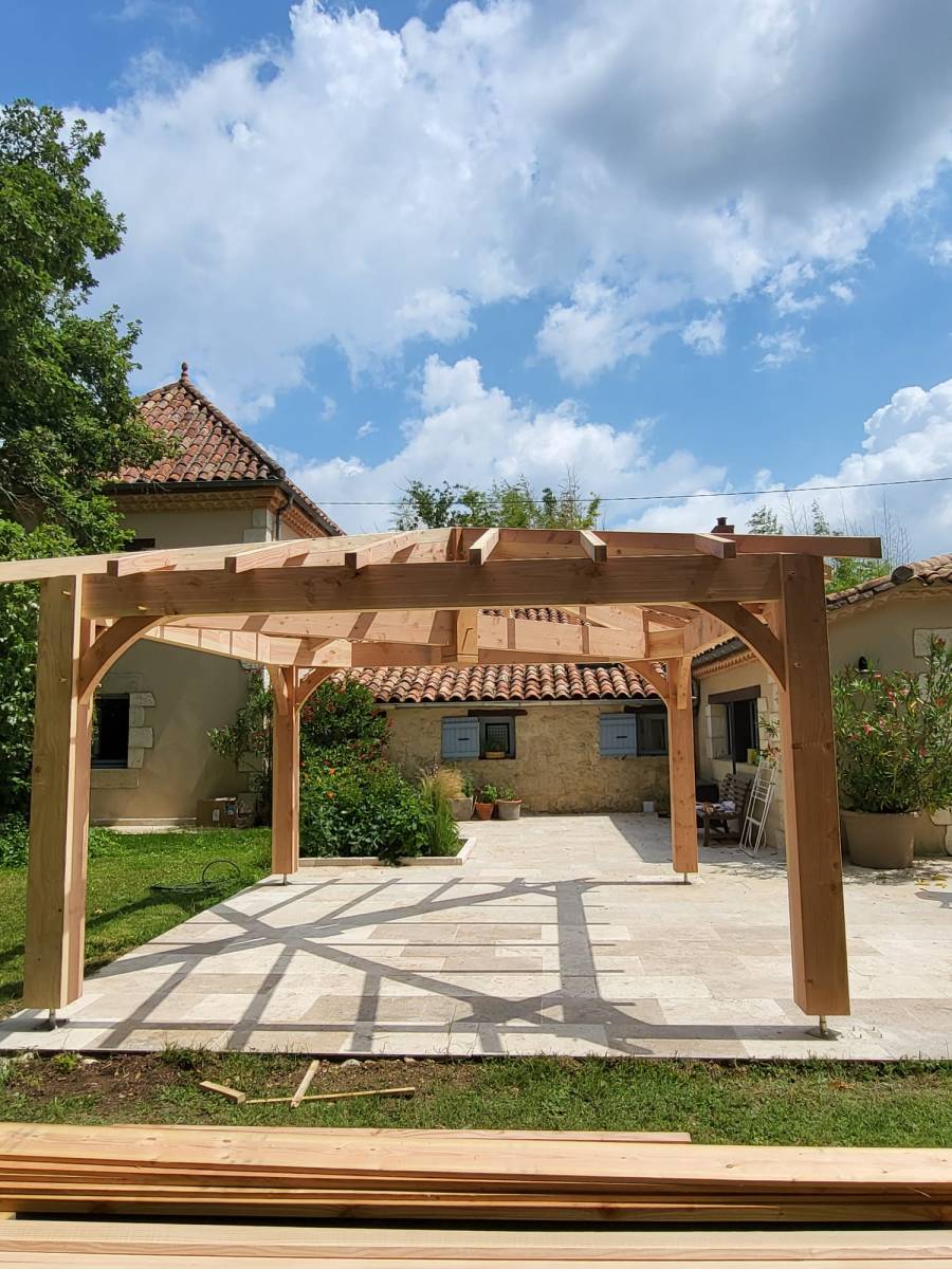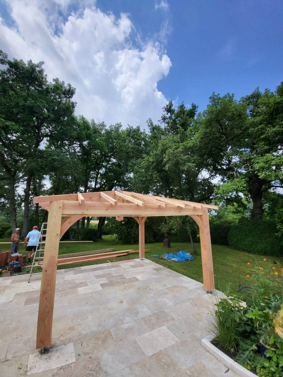 Cette réalisation d’aménagement extérieur en bois dans le Gers met en valeur un kiosque en ossature bois conçu pour créer un coin terrasse couvert, chaleureux et parfaitement intégré à son environnement.
