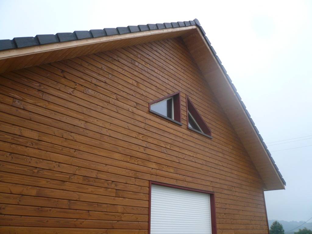 Pour la conception de votre maison bois en auto construction, un technicien Cogebois est présent pour vous assister. Cette maison en bardage douglas saturé miel d'environ 167m2 habitable offre confort et bien-être. L'aspect naturel du bois met en valeur les menuiseries qui sont en PVC blanc, de plus les tuiles plates rendent la maison moderne tout en respectant le style du département des Pyrénées. Les 2 menuiseries fixes de forme triangulaires habille le pignon de cette façade et apporte la clarté dans la pièce à vivre.