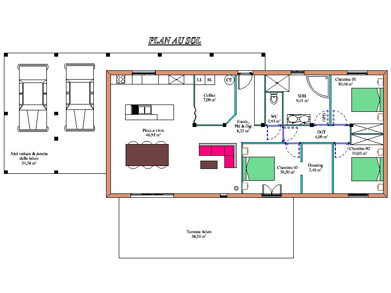Maison de plain-pied qui a une surface HORS D'EAU - HORS D'AIR de 221.59 m² et surface HABITABLE de 114.02 m². Cette maison comporte trois chambres et l'une d'elle a un dressing. La cuisine est ouverte sur le salon, et séjour. Les propriétaires ont décidé d'avoir une grande terrasse exposée sud de 38 m² environ et d'un grand garage pouvant accueillir deux voitures. La maison a un toit terrasse et son bardage est en douglas saturé couleur miel. Les menuiseries sont en bois, pvc, et aluminium. La terrasse est en béton.