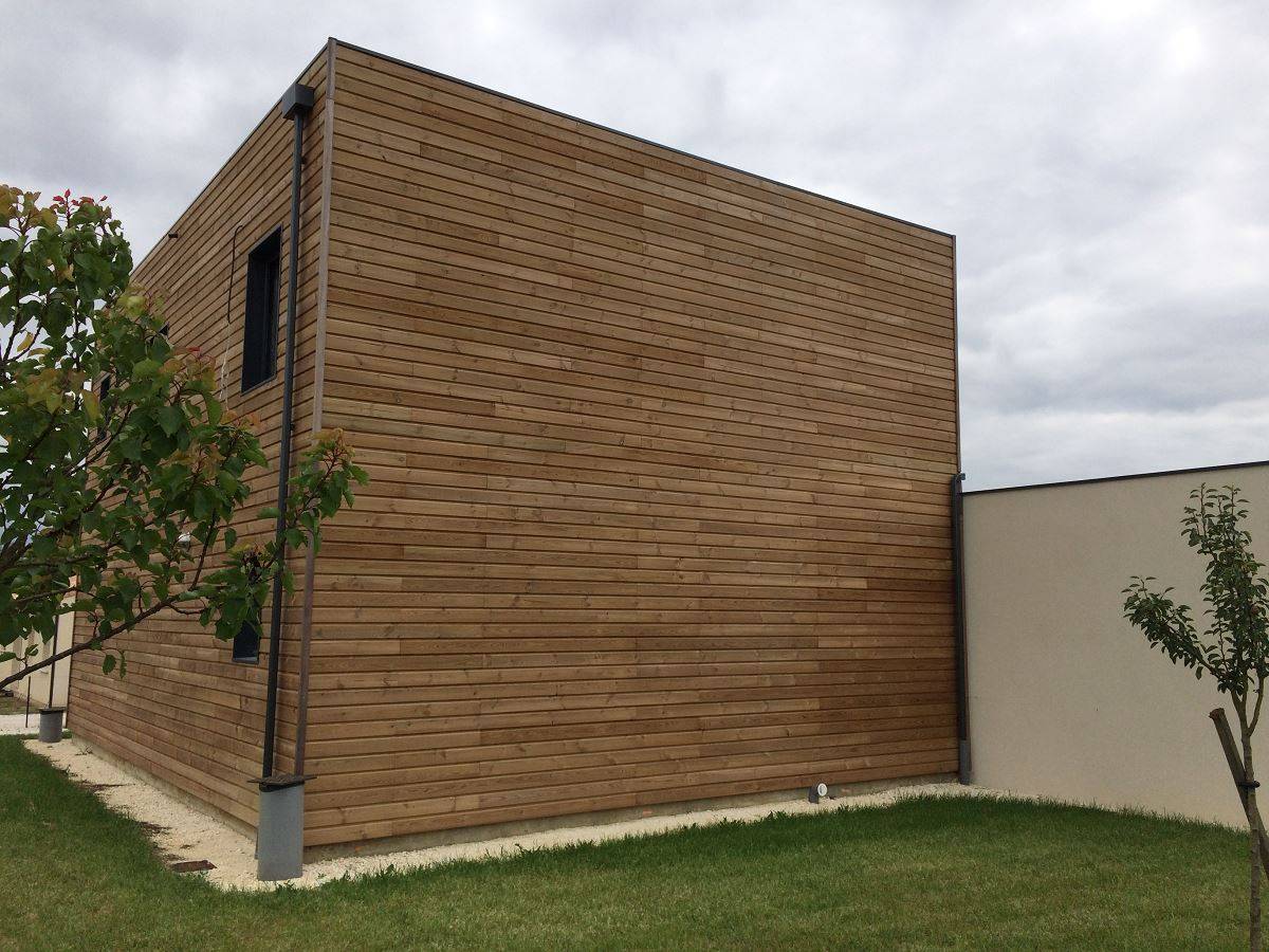 Les façades sont traitées avec différents matériaux : crépis "ton pierre" pour le garage et bardage en clin maritime traité classe 4, posé horizontalement au niveau du cube central et l'étage, et posé verticalement sur le cube désaxé.