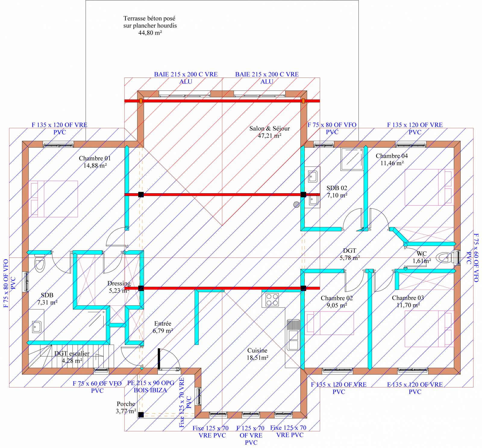 D'une surface habitable de 142,63 m², cette maison offre un agencement convivial et fonctionnel, idéal pour une famille ou un couple. Elle comprend une vaste pièce de vie lumineuse avec cuisine séparée, quatre chambres, deux salles de bain et une terrasse en béton de 44,80 m². La conception de la maison favorise une circulation fluide et une grande fonctionnalité, pour un quotidien en toute sérénité.