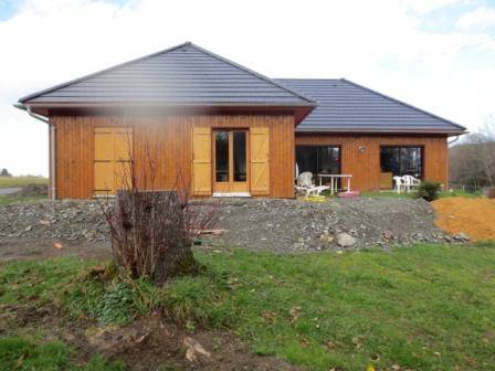 Maison à ossature bois de 129.92m2 habitable au rez-de-chaussée dont la pente de toit est de 80%. Cette maison se veut agréable et chaleureuse grâce à sa teinture clin douglas saturé et ses menuiseries en bois et PVC en totale harmonie avec ses tuiles plates noires qui respectent le style de la région. Les baies vitrées donnent sur une belle vue. Cette maison donne un aspect chalet, c'est ce qu'à voulu faire partager les propriétaires.