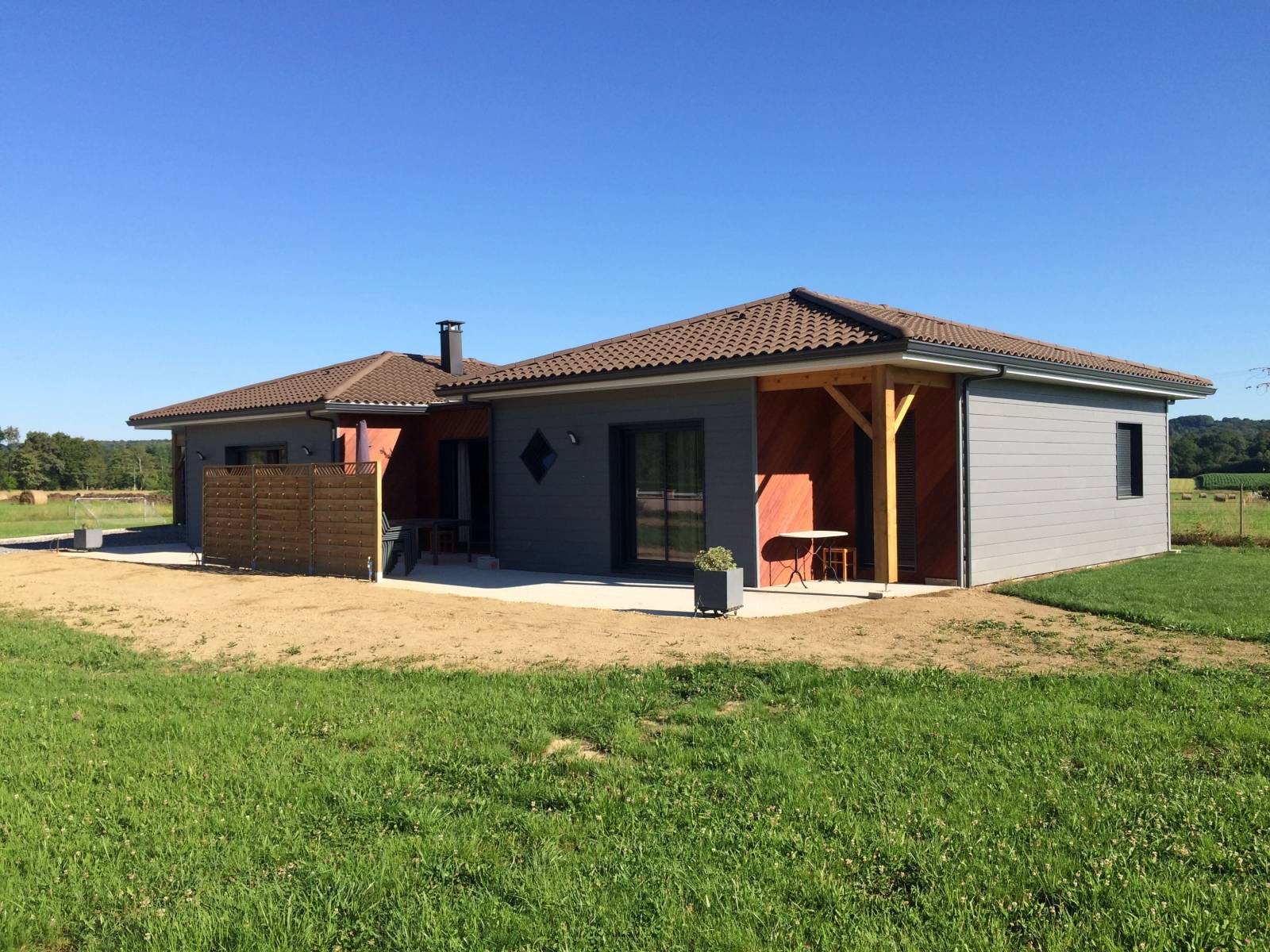 Découvrez cette maison individuelle de plain-pied en ossature bois près de Lannemezan (65), un projet de construction contemporaine signé Cogebois. Implantée sur une belle parcelle de 2 200 m², cette maison en ossature bois combine simplicité architecturale et élégance des matériaux.