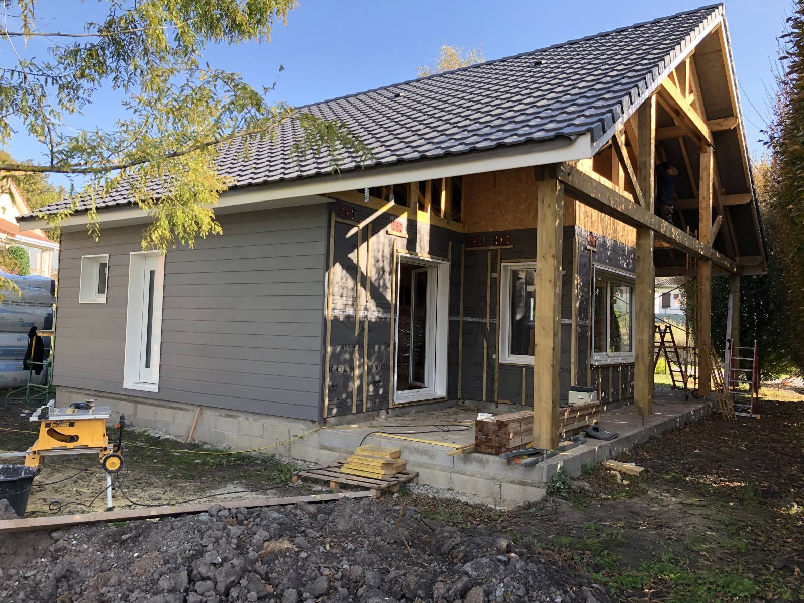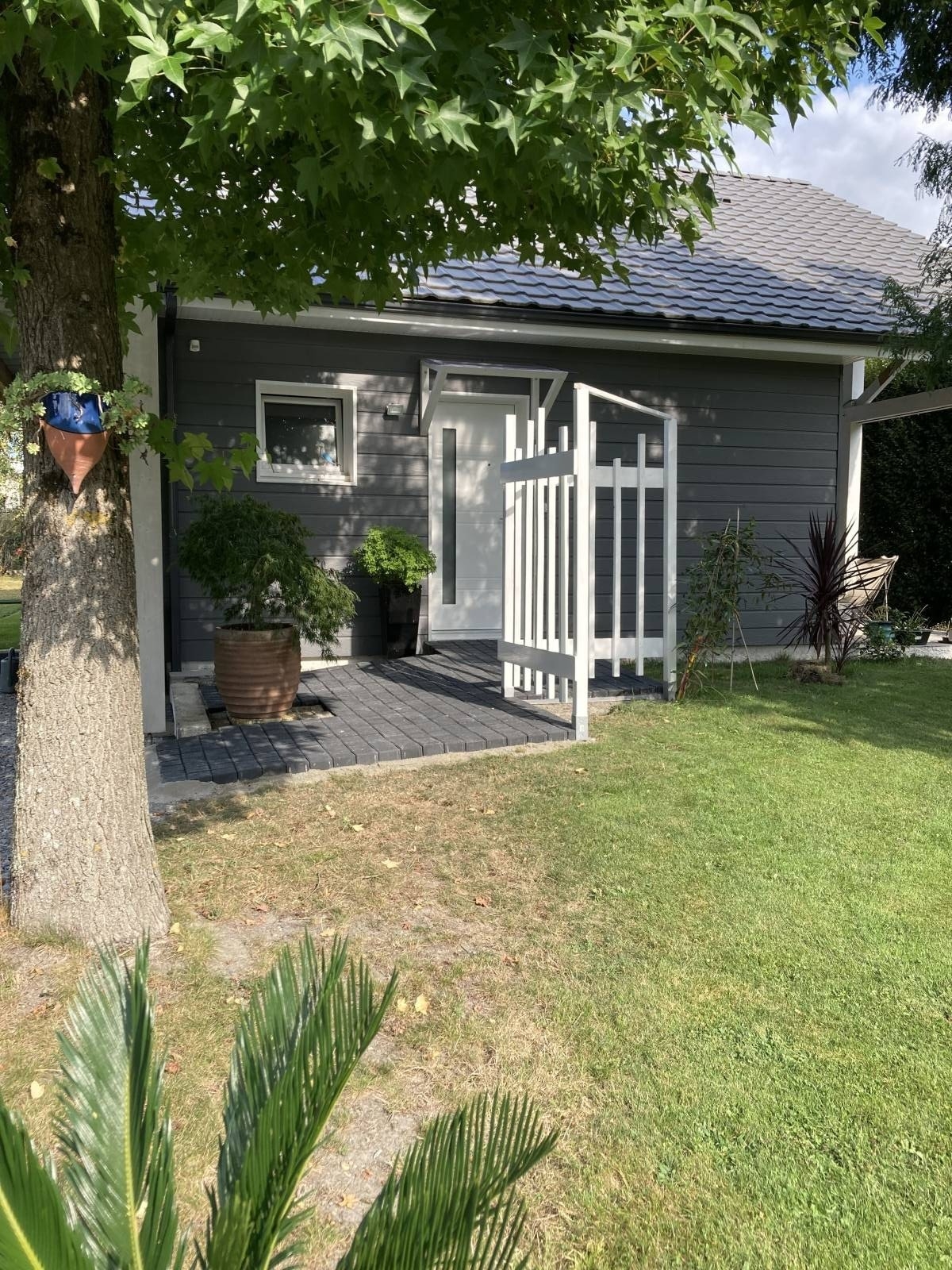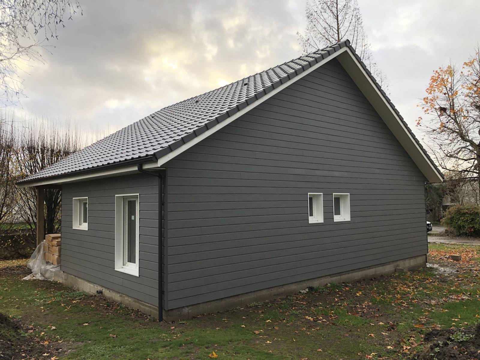 Les façades en bardage bois gris ardoise et les menuiseries blanches en aluminium et PVC confèrent à l’ensemble une allure contemporaine et lumineuse. La terrasse béton au sud prolonge l’espace de vie vers le jardin, déjà richement arboré.