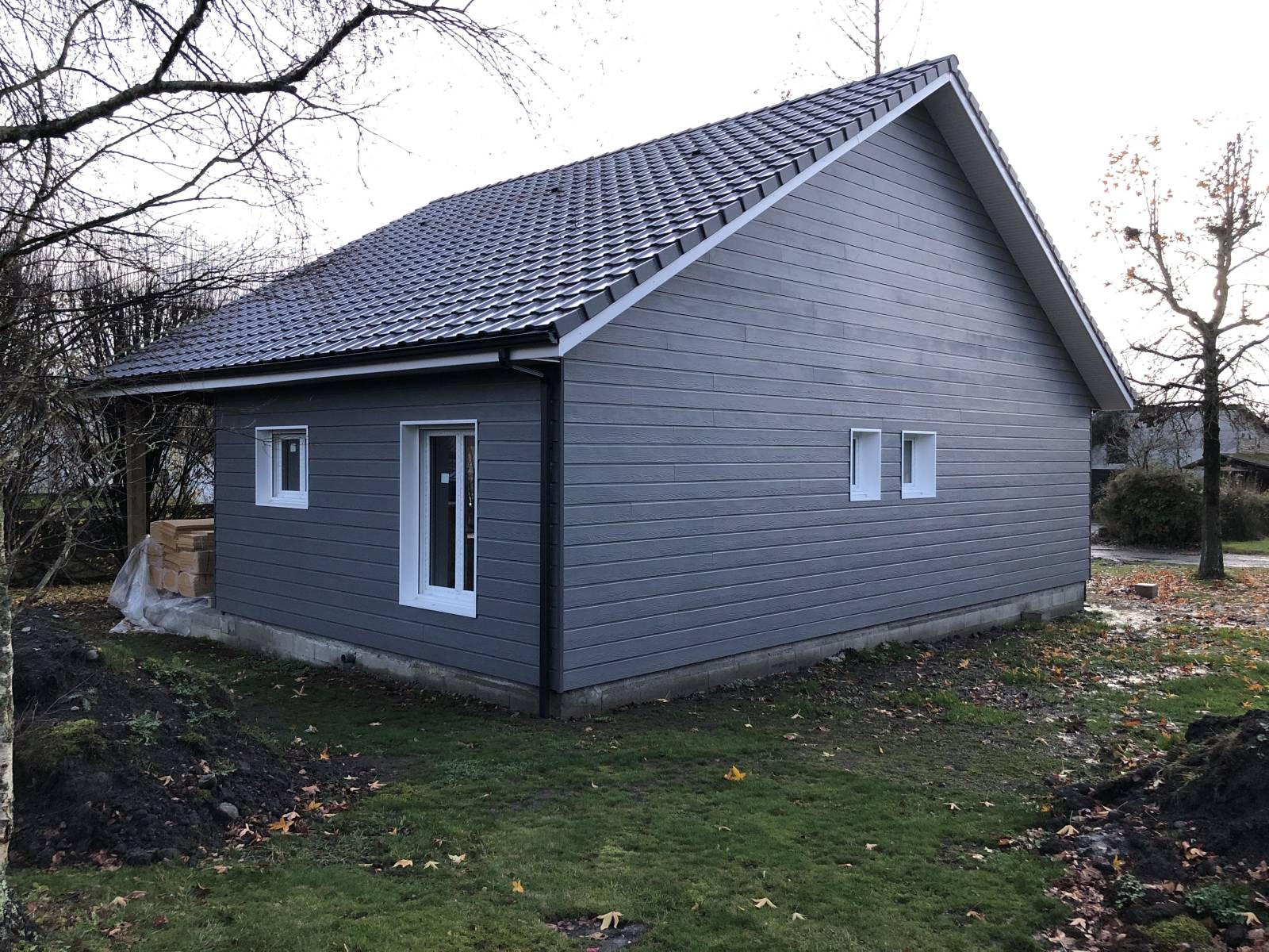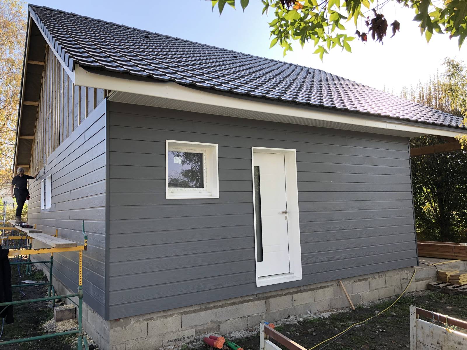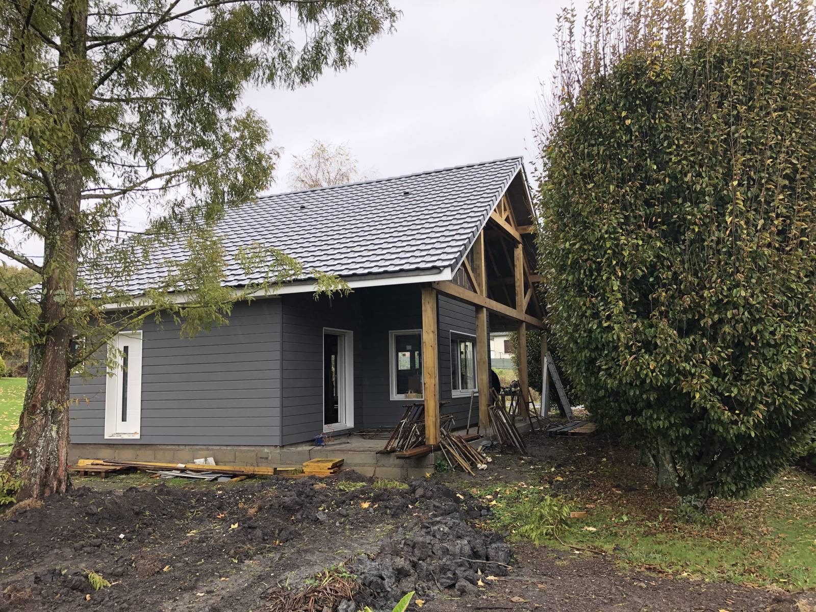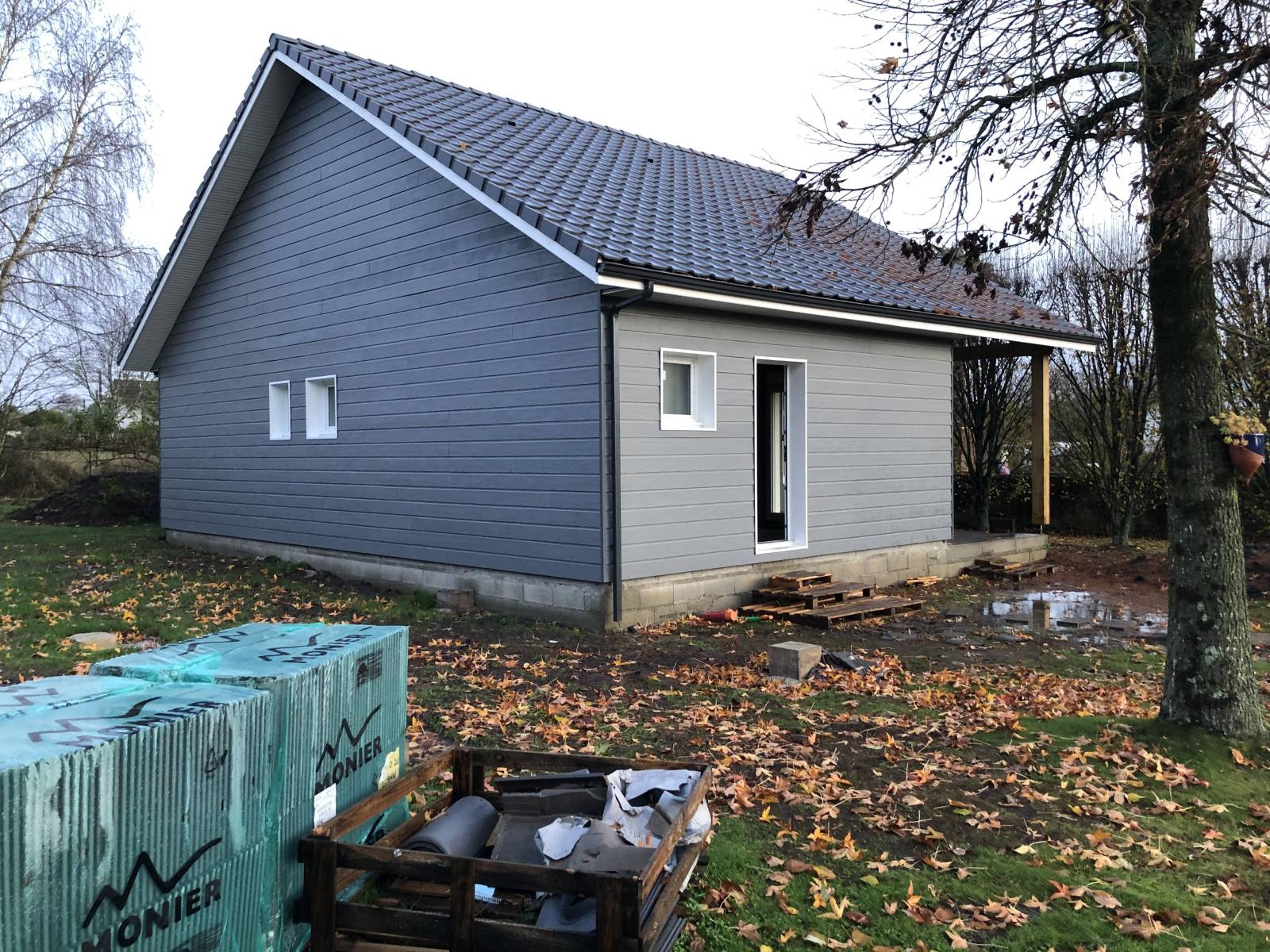 Les façades en bardage bois gris ardoise et les menuiseries blanches en aluminium et PVC confèrent à l’ensemble une allure contemporaine et lumineuse. La terrasse béton au sud prolonge l’espace de vie vers le jardin, déjà richement arboré.