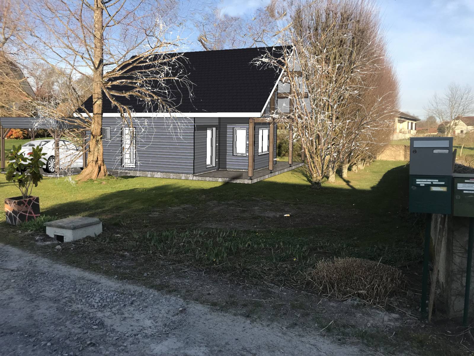 L’habitation se distingue par ses volumes simples et équilibrés, couverte d’une toiture à deux pans en tuiles noires, tandis que l’abri voiture en bois accolé dispose d’un toit plat végétalisé, alliant esthétique et performance environnementale.