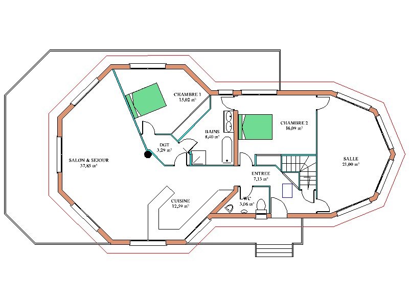 Cette construction de Maison à ossature bois a une architecture particulière très facile à vivre.