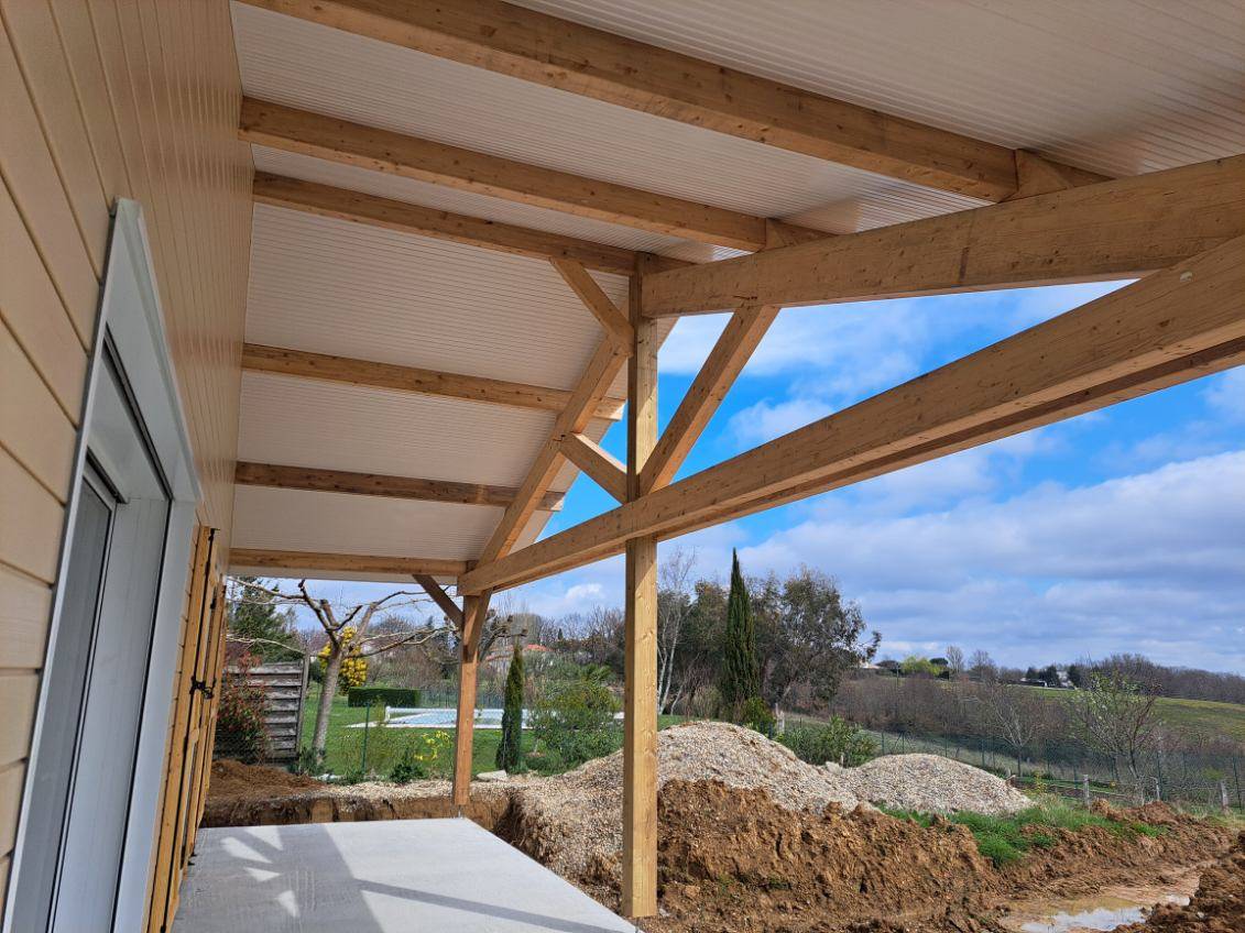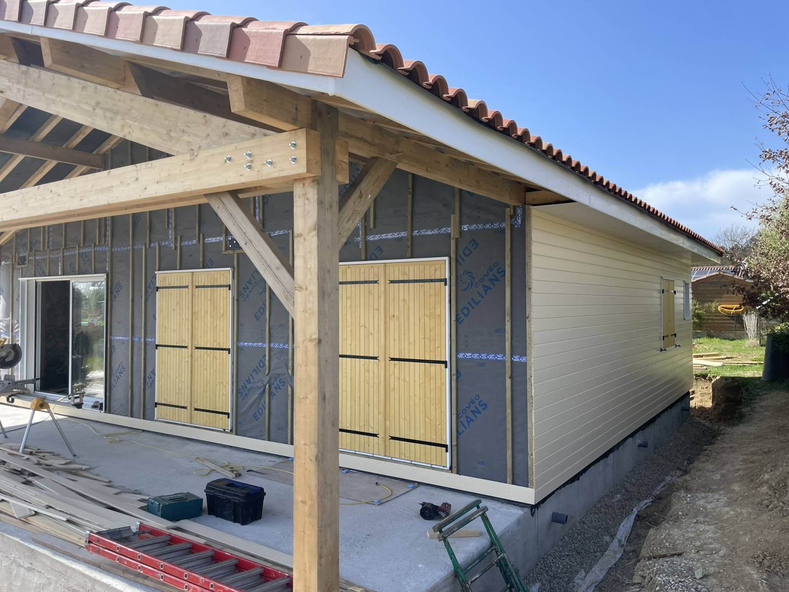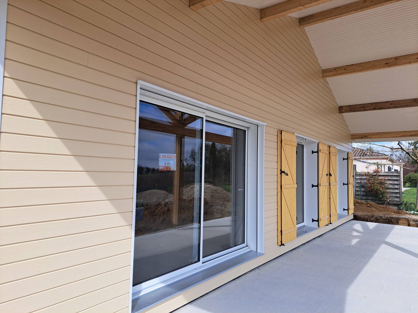 Le bardage bois horizontal teinte “beige ocré” apporte chaleur et douceur à l’ensemble, en cohérence avec les habitations voisines aux tonalités naturelles.