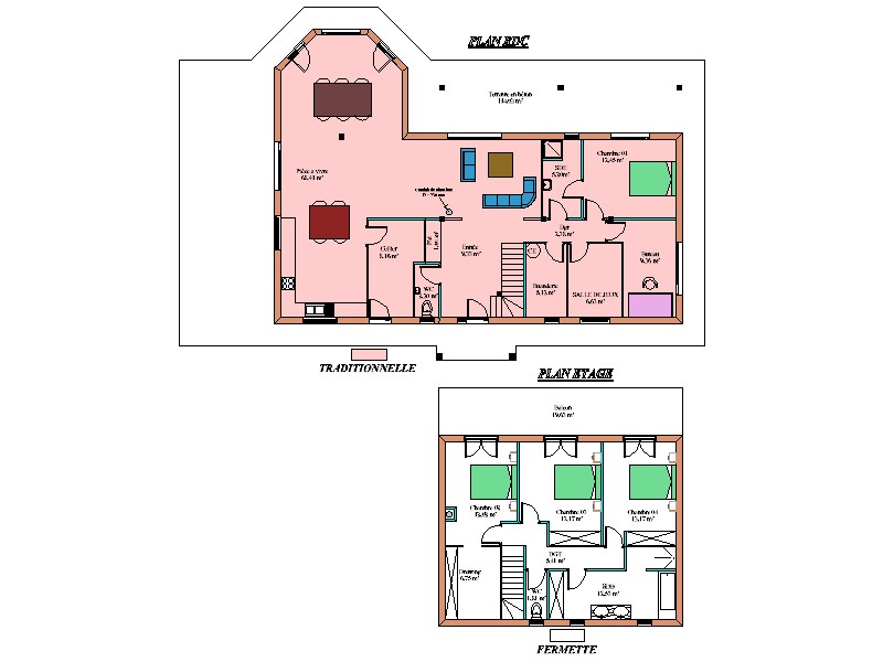 La charpente mixte en fermettes et traditionnelle, la pente de toit de 45% et la couverture en tuile plate noire garantissent une robustesse et une étanchéité irréprochables. Le bardage extérieur en clin couleur apporte une touche de modernité et d'authenticité à la maison, tout en s'intégrant parfaitement à son environnement. Les menuiseries en bois, PVC et aluminium, quant à elles, assurent une isolation thermique optimale et un design élégant.